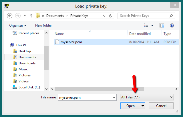 2 – Seleccionaremos el archivo .pem, por defecto solo muestra los archivos .ppk así que escogeremos “mostrar todos” del desplegable.